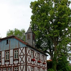 Der Rundweg startet am alten Rathaus und führt rechts entlang die Bergstraße hinauf bis zum Friedhof.
