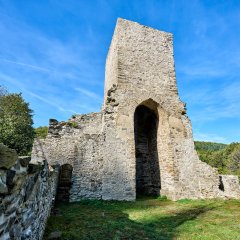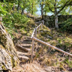 Der weitere Weg führt bei stetigem Anstieg zu einem schönen Aussichtspunkt, dieser Abschnitt ist auch bekannt als „Hundert-Stufen-Weg“. Oben angekommen laden mehrere Bänke ein, die eindrucksvollen Fernblicke über das Weiltal zu genießen. Auf einer dieser Bänke leistet ein Roter Mönch den Besucherinnen und Besuchern Gesellschaft. Bergab geht es dann wieder zurück zum Ausgangspunkt, der Kirchenruine Landstein.