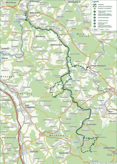 Von der ehemaligen Wallfahrtskirche „Unsere lieben Frau zum Landstein“ führt die Route auf dem Rad- und Wanderweg Weiltalweg hinauf in Richtung Neuweilnau, mit dem schon aus weiter Ferne sichtbaren Schloss. Weiter geht es durch offene Landschaften und am Waldrand entlang nach Altweilnau mit seinen Fachwerkhäusern im Ortskern und der imposanten Burgruine.
