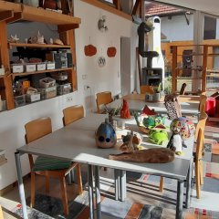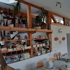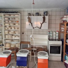 Hier kann man in Ruhe sein eigenes Geschirr, Skulpturen oder Gartenkeramik etc. persönlich gestalten. Es stehen viele Gipsformen und über 100 verschiedenen Farben zur Auswahl. Auch 3 Töpferscheiben sind vorhanden, an denen man sich ausprobieren kann.