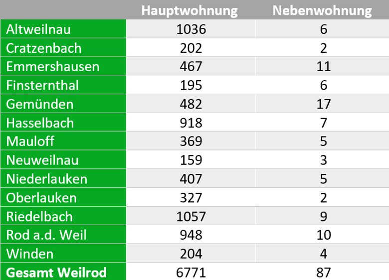 Nachstehend finden Sie die Einwohnerzahlen der Gemeinde Weilrod:
